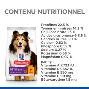 Hill’s Science Plan ALIMENT POUR CHIEN ADULTE Sensitive Stomach & Skin au POULET (poulet 8 %, total volaille 12 %) est un aliment complet pour les chiens adultes à partir de 1 an.
